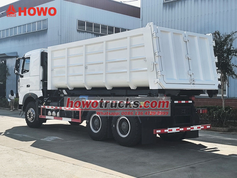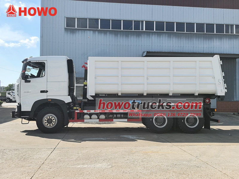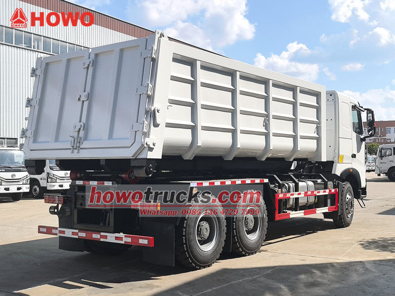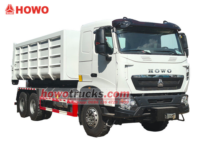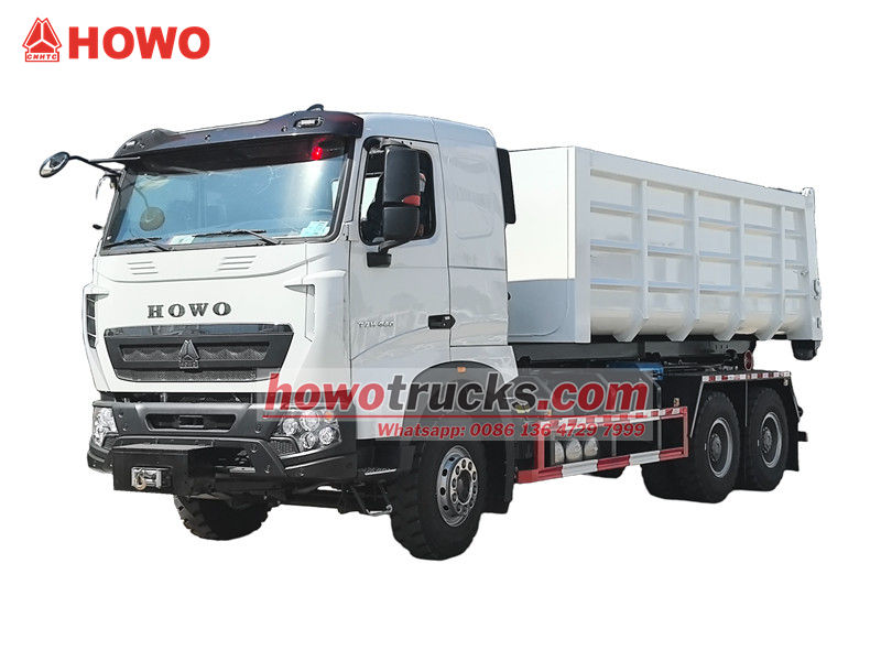 Ang HOWO 20tons hook loader truck ay isang lubos na mahusay at maaasahang sasakyan na idinisenyo para sa pamamahala ng basura sa mga lungsod at suburban area. May 4325+1350mm wheelbase na may MC11.44-50 440hp diesel engine, 10.518L emission. HW19710 transmission, 10-forward gear, 2-reverse gear, 12.00R20 na gulong na may kabuuang 11 piraso, may A/C, USB, direction assistance, 3 upuan. Ang carriage at chassis ay may hiwalay na istraktura. Sa pamamagitan ng hydraulic hook arm device sa likuran ng sasakyan, mabilis nitong maikakabit at maihahatid ang mga karaniwang basurahan, na nakakamit ang isang "isang sasakyan, maraming basurahan" na circulation operation mode.