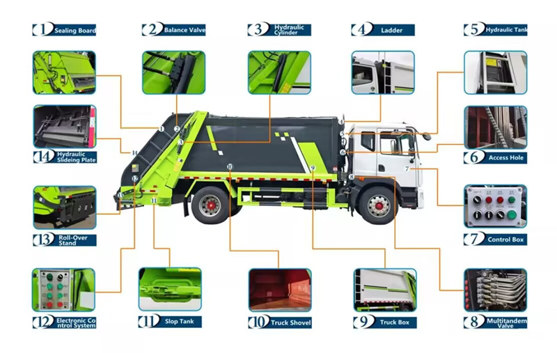 ●Selyado at Hindi Tumatagas: Ang hydraulic locking ng kompartamento at ang dobleng selyadong pinto sa likuran, kasama ang isang labangan para sa pagkolekta ng tubig sa ilalim, ay pumipigil sa pagtagas at amoy ng wastewater.