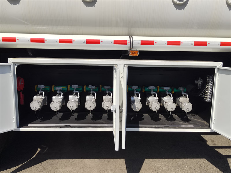 Nilagyan ng mga pantakip sa manhole na pamantayan ng Europa (may mga balbula ng paghinga at mga balbulang anti-overflow), mga sistema ng pagbawi ng singaw, at mga balbulang aluminyo na may haluang metal na hindi tinatablan ng apoy. Ang tangkeng 6mm na pinatibay na carbon steel ay nagbibigay ng maraming pananggalang upang epektibong maiwasan ang mga tagas at panganib ng pagsabog, na sumusunod sa mga pamantayan sa transportasyon ng mga mapanganib na materyal.