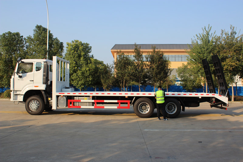 Ang HOWO 25-ton flatbed self loader ay ginawa gamit ang SINOTRUK HOWO heavy-duty chassis at nilagyan ng high-power Weichai WP10.380E53 engine, na naghahatid ng 380 horsepower at sumusunod sa mga pamantayan ng emisyon ng Euro V. Ang superstructure nito ay nagtatampok ng 8,600 mm na haba ng flatbed na maaaring palawakin nang hydraulically hanggang 3 metro. Ang deck ay gawa sa 10 mm na anti-slip patterned steel plate at may kasamang 25-toneladang front hydraulic outriggers, isang 8-toneladang hydraulic winch, at isang 2-metrong hydraulic folding ramp. Tinitiyak nito ang ligtas at mahusay na transportasyon at pagkarga/pagbaba ng karga ng malalaking makinarya sa inhinyeriya, kaya malawak itong magagamit sa mga construction site, operasyon ng pagmimina, at transportasyon ng logistik.