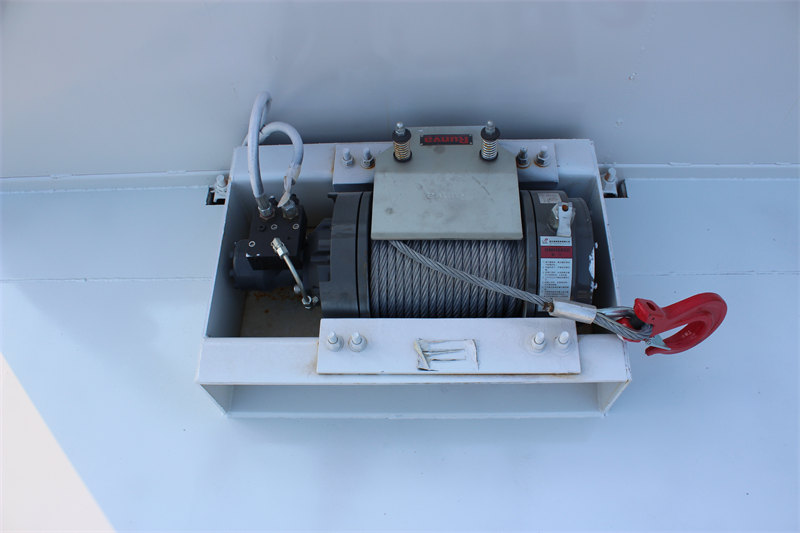 4. Mahusay na Pag-load at Pagbaba ng Karga sa Sarili: Nagtatampok ng 8-toneladang hydraulic winch, 2-metrong hydraulic ramp, at 25-toneladang front hydraulic support leg, na nagpapahintulot sa malayang pagkarga at pagbaba ng kagamitan nang hindi umaasa sa karagdagang makinarya.