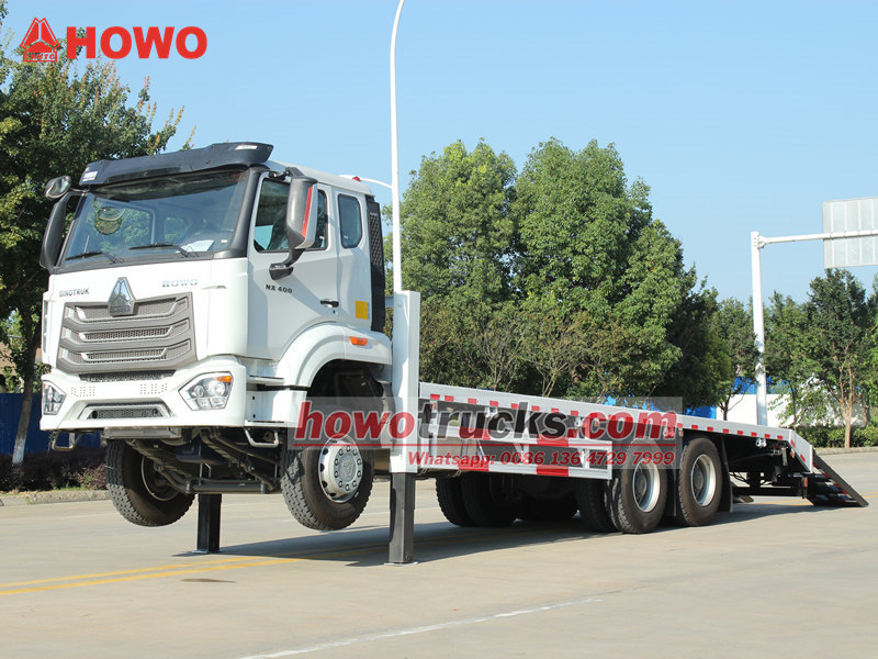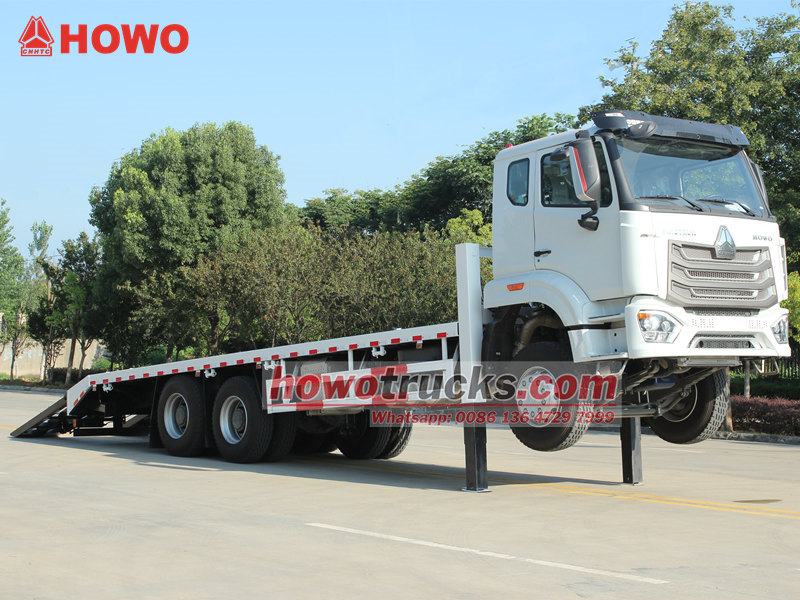 Ang HOWO NX Self Loader Truck ay isang propesyonal na sasakyan na partikular na idinisenyo para sa transportasyon ng malalaking makinarya sa konstruksyon. Ginawa gamit ang isang HOWO 6×4 drive chassis, pinapagana ito ng isang 400HP Weichai high-pressure common rail engine, na naghahatid ng matibay na pagganap na may mataas na kahusayan at pagsunod sa kapaligiran. Ang sasakyan ay nilagyan ng isang 8600×2500 mm anti-slip flatbed, dalawang 20-toneladang front lifting hydraulic outriggers, at isang 4-toneladang hydraulic winch, na bumubuo ng isang ligtas at maaasahang sistema ng pagkarga at pagdiskarga na ganap na nakakatugon sa mga pangangailangan sa transportasyon at on-site na operasyon ng mabibigat na excavator at iba pang kagamitan.