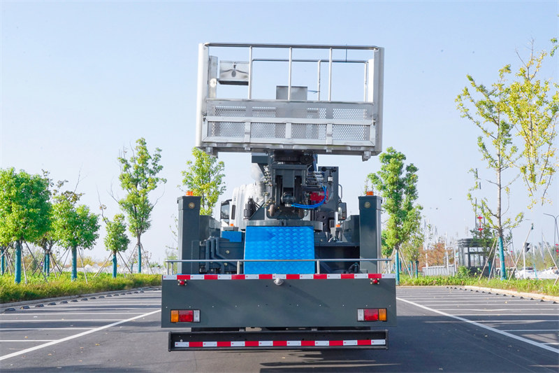 Ang kakaibang disenyo ng H-type hydraulic outrigger nito ay may pahalang at patayong distansya ng pagpapalawak na 8,600 mm at nilagyan ng two-way hydraulic locking mechanism upang matiyak ang katatagan habang ginagamit. Ang trak ay nilagyan din ng dual operating system ng manual at wireless remote control, isang platform rated load na 250 kg, 360° hydraulic rotation, at built-in na maraming safety protection device, tulad ng automatic out-of-bounds limit, emergency stop device at leakage protection.