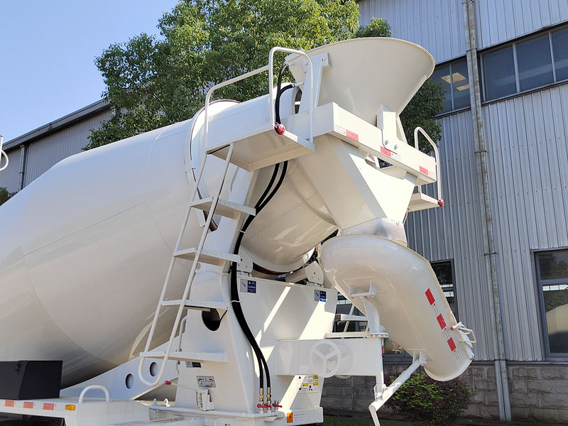 3. Tangke ng Paghahalo: Ang mixing drum ay isang mahalagang bahagi ng buong concrete mixer truck. Ito ay nagsisilbing lalagyan para sa pag-iimbak ng kongkreto at gumaganap ng mahalagang papel sa pagpigil sa pagtigas at paghihiwalay ng kongkreto. Ang mga talim sa loob ng tangke ay pangunahing nagsisilbing haluin at gabayan ang kongkreto.