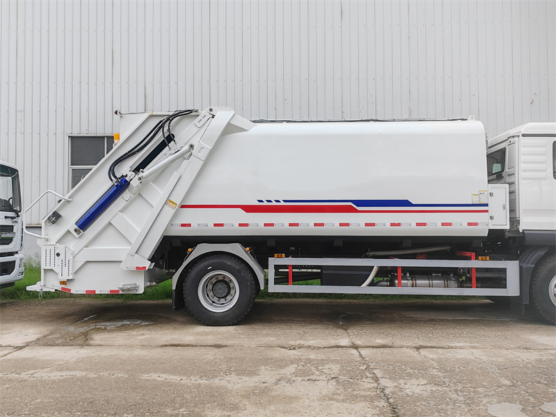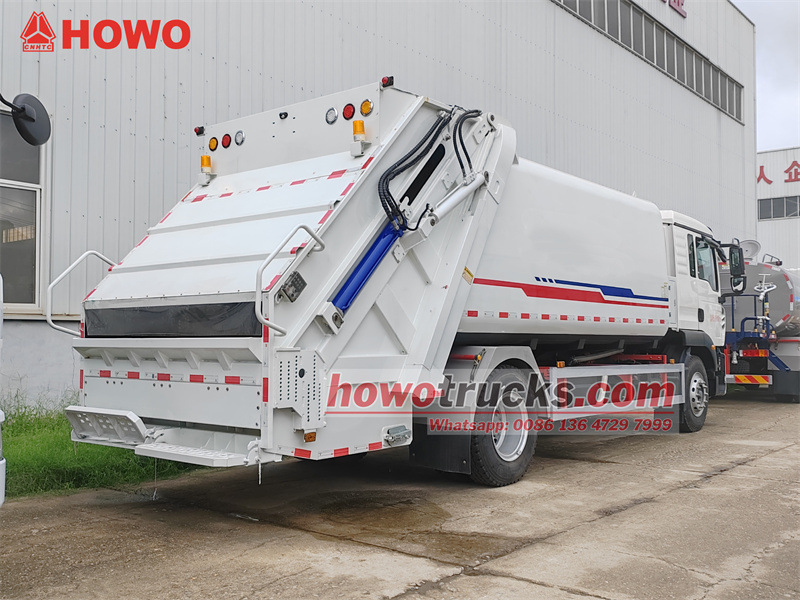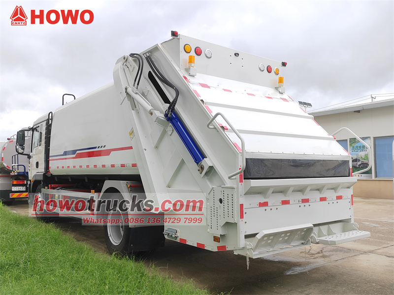 Ang HOWO 4x2 16 cbm garbage compactor truck ay gumagamit ng Sinotruk HOWO TX 2280 one and half-row cab chassis na may 4700mm wheelbase, at nilagyan ng Sinotruk MC07.25-60 Euro 6 250 horsepower engine at HW95508STCL 8-speed gearbox. Mayroon itong pinakamataas na bilis na 101km/h. Ang itaas na bahagi ng trak ay isang 16 cbm compactor garbage box na gawa sa carbon steel na may kurbadong katawan ng tangke at anti-corrosion at rust-proof treatment., gilid na 5mm sa ilalim at 6mm na kapal. Nilagyan ito ng 200L na tangke ng dumi sa alkantarilya at hydraulic oil tank. Walang flip mechanism sa likuran, ngunit may dalawang natitiklop na pedal para sa madaling pagtatapon ng basura. Ang filler ay nilagyan ng takip. Ang trak ay may CAN-BUS electronic control system, pneumatic system, at hydraulic system control, at compactor ratio na 3.4:1.