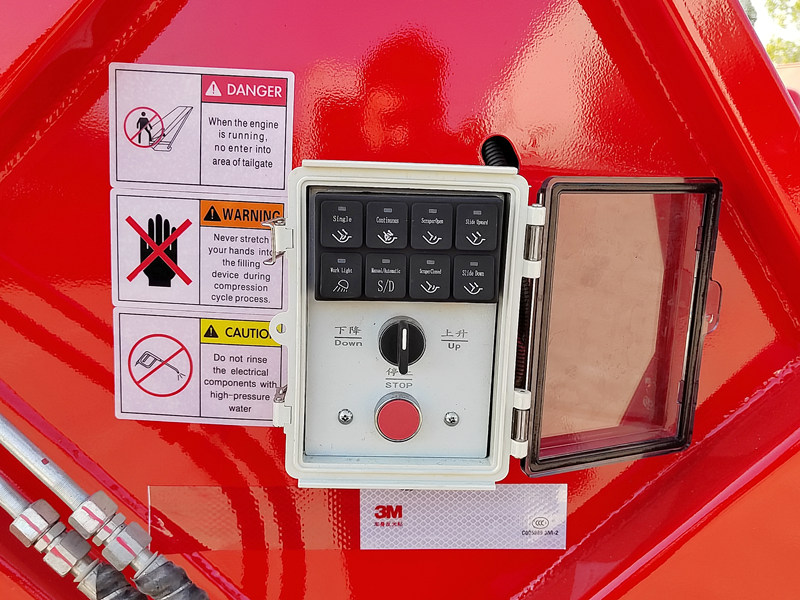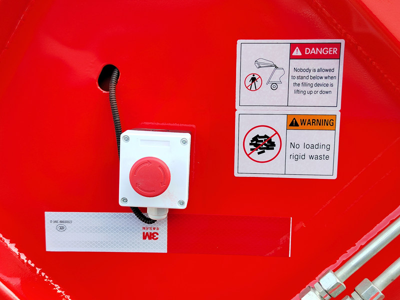 ►Ang isang espesyal na idinisenyong buton para sa emergency brake ay nagbibigay-daan sa mekanismo ng pagsiksik ng basura na huminto sa anumang estado o posisyon, na tinitiyak ang kaligtasan ng mga tauhan at kagamitan.