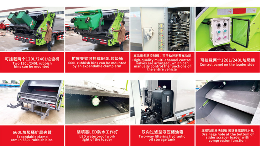 ●Tinitiyak ng sistema ng kompresyon na hindi madaling matapon ang basura, na epektibong pumipigil sa pangalawang polusyon.