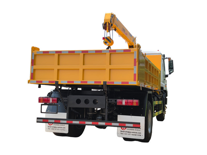 Ang SINOTRUK HOWO dump truck mounted crane ay isang maraming gamit na sasakyang pang-inhinyero na pinagsasama ang parehong mga tungkulin ng pagbubuhat at pagdurugtong-lupa. Nilagyan ng isang malakas na U-shaped boom at isang cargo box lifting system, maaari itong magsagawa ng 360° rotating lifting operations pati na rin ang material self-unloading. Dahil sa maximum na kapasidad ng pagbubuhat na 4 na tonelada at maximum na taas ng pagbubuhat na 10 metro, angkop ito para sa iba't ibang sitwasyon tulad ng mga construction site at bodega. Dinisenyo na may proteksyon sa overload at malalawak na outrigger, tinitiyak nito ang ligtas at mahusay na operasyon.